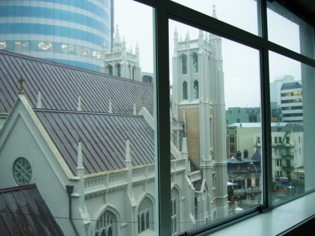Got sandwich lunches and left for the airport. We had a little plane with propellers and seats 2x2. It was only a 1 hour flight to Wellington, but as always, Air New Zealand gave us great service. Even for such a short flight we got water, a hot beverage, a biscuit, and a hard candy. Got on the van to Nexus. My room has a very big window, which is lucky since there are several rooms with just one tiny window way up at the top of a very high ceiling.