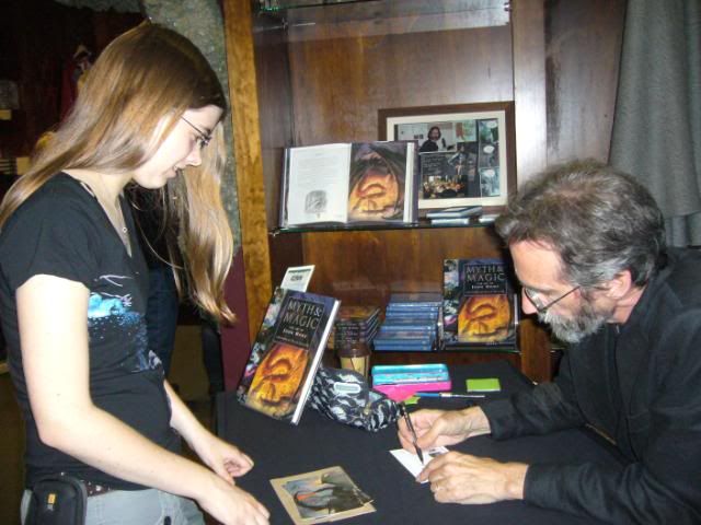 Everyone is gone except Melissa, and Stefani and Nicole and I who are all leaving Monday morning. Theres only 6 people in the whole building right now. I set my alarm for 9 figuring that I would be up at 8 because of daylight savings. When I got up my computer said it was 7, my phone said it was 8, and my alarm said it was 9. The official time online said it was 7, so I reset all my electronics accordingly. At noon Nicole and I went to the bus stop and headed out to Weta. John Howe and Alan Lee are in New Zealand to work on concept art for The Hobbit. John Howe was at the Weta Cave for the release of his new book, “West of the Mountains, East of the Sea: the Map of Tolkien’s Beleriand.” The line wasn’t too long, but took forever since he was doing little drawings in the books he was signing. I got a postcard signed, and Nicole got a “Myth and Magic” book.